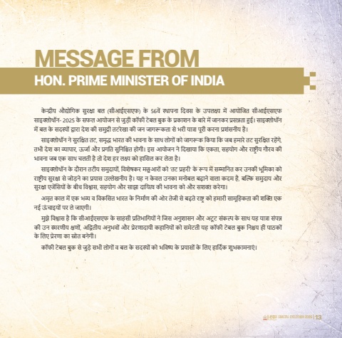12 13%u0915%u0947 %u0928%u094d%u0926%u094d%u0930%u0940%u092f %u0914%u0926%u094d%u092f%u094b%u0917%u093f%u0915 %u0938%u0941%u0930%u0915%u094d%u0937%u093e %u092c%u0932 (%u0938%u0940%u0906%u0908%u090f%u0938%u090f%u092b) %u0915%u0947 56%u0935%u0947%u0902 %u0938%u094d%u0925%u093e%u092a%u0928%u093e %u0926%u093f%u0935%u0938 %u0915%u0947 %u0909%u092a%u0932%u0915%u094d%u0937%u094d%u092f %u092e%u0947%u0902 %u0906%u092f%u094b%u091c%u093f%u0924 %u0938%u0940%u0906%u0908%u090f%u0938%u090f%u092b %u0938%u093e%u0907%u0915%u094d%u0932%u094b%u0925%u0949%u0928- 2025 %u0915%u0947 %u0938%u092b%u0932 %u0906%u092f%u094b%u091c%u0928 %u0938%u0947 %u091c%u0941%u0921%u093c%u0940 %u0915%u0949%u092b%u0940 %u091f%u0947%u092c%u0932 %u092c%u0941%u0915 %u0915%u0947 %u092a%u094d%u0930%u0915%u093e%u0936%u0928 %u0915%u0947 %u092c%u093e%u0930%u0947 %u092e%u0947%u0902 %u091c%u093e%u0928%u0915%u0930 %u092a%u094d%u0930%u0938%u0928%u094d%u0928%u0924%u093e %u0939%u0941%u0908%u0964 %u0938%u093e%u0907%u0915%u094d%u0932%u094b%u0925%u0949%u0928 %u092e%u0947%u0902 %u092c%u0932 %u0915%u0947 %u0938%u0926%u0938%u094d%u092f%u094b%u0902 %u0926%u094d%u0935%u093e%u0930%u093e %u0926%u0947%u0936 %u0915%u0940 %u0938%u092e%u0941%u0926%u094d%u0930%u0940 %u0924%u091f%u0930%u0947%u0916%u093e %u0915%u0940 %u091c%u0928 %u091c%u093e%u0917%u0930%u0942%u0915%u0924%u093e %u0938%u0947 %u092d%u0930%u0940 %u092f%u093e%u0924%u094d%u0930%u093e %u092a%u0942%u0930%u0940 %u0915%u0930%u0928%u093e %u092a%u094d%u0930%u0936%u0902%u0938%u0928%u0940%u092f %u0939%u0948%u0964%u0938%u093e%u0907%u0915%u094d%u0932%u094b%u0925%u0949%u0928 %u0928%u0947 %u0938%u0941%u0930%u0915%u094d%u0937%u093f%u0924 %u0924%u091f, %u0938%u092e%u0943%u0926%u094d%u0927 %u092d%u093e%u0930%u0924 %u0915%u0940 %u092d%u093e%u0935%u0928%u093e %u0915%u0947 %u0938%u093e%u0925 %u0932%u094b%u0917%u094b%u0902 %u0915%u094b %u091c%u093e%u0917%u0930%u0942%u0915 %u0915%u093f%u092f%u093e %u0915%u093f %u091c%u092c %u0939%u092e%u093e%u0930%u0947 %u0924%u091f %u0938%u0941%u0930%u0915%u094d%u0937%u093f%u0924 %u0930%u0939%u0947%u0902%u0917%u0947, %u0924%u092d%u0940 %u0926%u0947%u0936 %u0915%u093e %u0935%u094d%u092f%u093e%u092a%u093e%u0930, %u090a%u0930%u094d%u091c%u093e %u0914%u0930 %u092a%u094d%u0930%u0917%u0924%u093f %u0938%u0941%u0928%u093f%u0936%u094d%u091a%u093f%u0924 %u0939%u094b%u0917%u0940%u0964 %u0907%u0938 %u0906%u092f%u094b%u091c%u0928 %u0928%u0947 %u0926%u093f%u0916%u093e%u092f%u093e %u0915%u093f %u090f%u0915%u0924%u093e, %u0938%u0939%u092f%u094b%u0917 %u0914%u0930 %u0930%u093e%u0937%u094d%u091f%u094d%u0930%u0940%u092f %u0917%u094c%u0930%u0935 %u0915%u0940%u092d%u093e%u0935%u0928%u093e %u091c%u092c %u090f%u0915 %u0938%u093e%u0925 %u091a%u0932%u0924%u0940 %u0939%u0948 %u0924%u094b %u0926%u0947%u0936 %u0939%u0930 %u0932%u0915%u094d%u0937%u094d%u092f %u0915%u094b %u0939%u093e%u0938%u093f%u0932 %u0915%u0930 %u0932%u0947%u0924%u093e %u0939%u0948%u0964%u0938%u093e%u0907%u0915%u094d%u0932%u094b%u0925%u0949%u0928 %u0915%u0947 %u0926%u094c%u0930%u093e%u0928 %u0924%u091f%u0940%u092f %u0938%u092e%u0941%u0926%u093e%u092f%u094b%u0902, %u0935%u093f%u0936%u0947%u0937%u0915%u0930 %u092e%u091b%u0941 %u0906%u0930%u094b%u0902 %u0915%u094b %u2018%u0924%u091f %u092a%u094d%u0930%u0939%u0930%u0940%u2019 %u0915%u0947 %u0930%u0942%u092a %u092e%u0947%u0902 %u0938%u092e%u094d%u092e%u093e%u0928%u093f%u0924 %u0915%u0930 %u0909%u0928%u0915%u0940 %u092d%u0942%u092e%u093f%u0915%u093e %u0915%u094b%u0930%u093e%u0937%u094d%u091f%u094d%u0930%u0940%u092f %u0938%u0941%u0930%u0915%u094d%u0937%u093e %u0938%u0947 %u091c%u094b%u0921%u093c%u0928%u0947 %u0915%u093e %u092a%u094d%u0930%u092f%u093e%u0938 %u0909%u0932%u094d%u0932%u0947%u0916%u0928%u0940%u092f %u0939%u0948%u0964 %u092f%u0939 %u0928 %u0915%u0947 %u0935%u0932 %u0909%u0928%u0915%u093e %u092e%u0928%u094b%u092c%u0932 %u092c%u0922%u093c%u093e%u0928%u0947 %u0935%u093e%u0932%u093e %u0915%u0926%u092e %u0939%u0948, %u092c%u0932%u094d%u0915%u093f %u0938%u092e%u0941%u0926%u093e%u092f %u0914%u0930 %u0938%u0941%u0930%u0915%u094d%u0937%u093e %u090f%u091c%u0947%u0902%u0938%u093f%u092f%u094b%u0902 %u0915%u0947 %u092c%u0940%u091a %u0935%u093f%u0936%u094d%u0935%u093e%u0938, %u0938%u0939%u092f%u094b%u0917 %u0914%u0930 %u0938%u093e%u091d%u093e %u0926%u093e%u092f%u093f%u0924%u094d%u0935 %u0915%u0940 %u092d%u093e%u0935%u0928%u093e %u0915%u094b %u0914%u0930 %u0938%u0936%u0915%u094d%u0924 %u0915%u0930%u0947%u0917%u093e%u0964%u0905%u092e%u0943%u0924 %u0915%u093e%u0932 %u092e%u0947%u0902 %u090f%u0915 %u092d%u0935%u094d%u092f %u0935 %u0935%u093f%u0915%u0938%u093f%u0924 %u092d%u093e%u0930%u0924 %u0915%u0947 %u0928%u093f%u0930%u094d%u092e%u093e%u0923 %u0915%u0940 %u0913%u0930 %u0924%u0947%u091c%u0940 %u0938%u0947 %u092c%u0922%u093c%u0924%u0947 %u0930%u093e%u0937%u094d%u091f%u094d%u0930 %u0915%u094b %u0939%u092e%u093e%u0930%u0940 %u0938%u093e%u092e%u0942%u0939%u093f%u0915%u0924%u093e %u0915%u0940 %u0936%u0915%u094d%u0924%u093f %u090f%u0915 %u0928%u0908 %u090a%u0902 %u091a%u093e%u0907%u092f%u094b%u0902 %u092a%u0930 %u0932%u0947 %u091c%u093e%u090f%u0917%u0940%u0964%u092e%u0941%u091d%u0947 %u0935%u093f%u0936%u094d%u0935%u093e%u0938 %u0939%u0948 %u0915%u093f %u0938%u0940%u0906%u0908%u090f%u0938%u090f%u092b %u0915%u0947 %u0938%u093e%u0939%u0938%u0940 %u092a%u094d%u0930%u0924%u093f%u092d%u093e%u0917%u093f%u092f%u094b%u0902 %u0928%u0947 %u091c%u093f%u0938 %u0905%u0928%u0941%u0936%u093e%u0938%u0928 %u0914%u0930 %u0905%u091f%u0942 %u091f %u0938%u0902%u0915%u0932%u094d%u092a %u0915%u0947 %u0938%u093e%u0925 %u092f%u0939 %u092f%u093e%u0924%u094d%u0930%u093e %u0938%u0902%u092a%u0928%u094d%u0928 %u0915%u0940 %u0909%u0928 %u0938%u094d%u092e%u0930%u0923%u0940%u092f %u0915%u094d%u0937%u0923%u094b%u0902, %u0905%u0926%u094d%u0935%u093f%u0924%u0940%u092f %u0905%u0928%u0941%u092d%u0935%u094b%u0902 %u0914%u0930 %u092a%u094d%u0930%u0947%u0930%u0923%u093e%u0926%u093e%u092f%u0940 %u0915%u0939%u093e%u0928%u093f%u092f%u094b%u0902 %u0915%u094b %u0938%u092e%u0947%u091f%u0924%u0940 %u092f%u0939 %u0915%u0949%u092b%u0940 %u091f%u0947%u092c%u0932