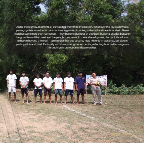 116 117Along the journey, moments of play added warmth to the mission. Whenever the route allowed a pause, cyclists joined local communities in games of cricket, volleyball and beach football. These matches were more than recreation %u2014 they became gestures of goodwill, building bridges between the guardians of the coast and the people they serve. In these shared games, the cyclothon found a rhythm beyond the road %u2014 a reminder that true security rests not only in vigilance, but also in participation and trust. Each rally and cheer strengthened bonds, reflecting how resilience grows through both protection and partnership.117