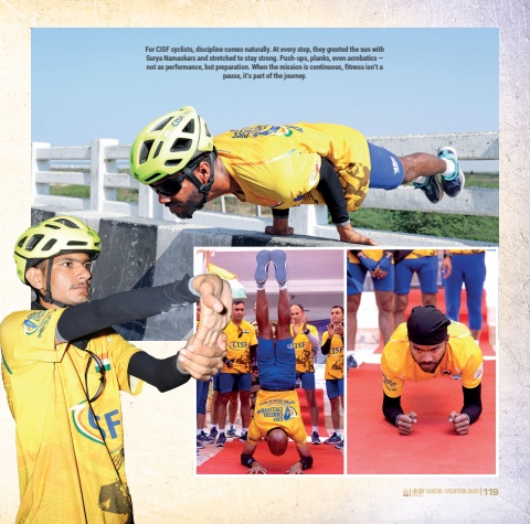 118 119For CISF cyclists, discipline comes naturally. At every stop, they greeted the sun with Surya Namaskars and stretched to stay strong. Push-ups, planks, even acrobatics %u2014 not as performance, but preparation. When the mission is continuous, fitness isn%u2019t a pause, it%u2019s part of the journey.