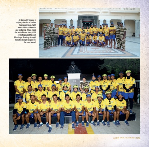 128 129At Somnath Temple in Gujarat, the site of India%u2019s first Jyotirlinga, faith meets history. Majestic and enduring, it has stood the test of time. Here, CISF cyclists paused to seek blessings, drawing strength from the temple%u2019s spirit for the road ahead.