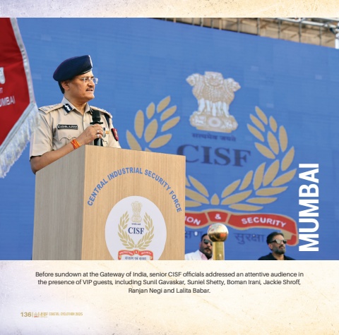 136 137Before sundown at the Gateway of India, senior CISF officials addressed an attentive audience in the presence of VIP guests, including Sunil Gavaskar, Suniel Shetty, Boman Irani, Jackie Shroff, Ranjan Negi and Lalita Babar.MUMBAI