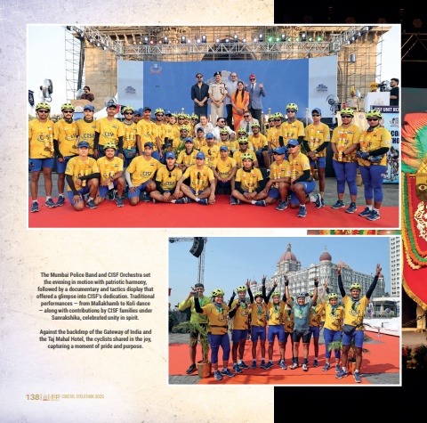 138 139The Mumbai Police Band and CISF Orchestra set the evening in motion with patriotic harmony, followed by a documentary and tactics display that offered a glimpse into CISF%u2019s dedication. Traditional performances %u2014 from Mallakhamb to Koli dance %u2014 along with contributions by CISF families under Sanrakshika, celebrated unity in spirit. Against the backdrop of the Gateway of India and the Taj Mahal Hotel, the cyclists shared in the joy, capturing a moment of pride and purpose.