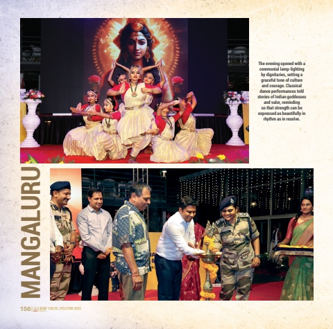 156 157 MANGALURUThe evening opened with a ceremonial lamp-lighting by dignitaries, setting a graceful tone of culture and courage. Classical dance performances told stories of Indian goddesses and valor, reminding us that strength can be expressed as beautifully in rhythm as in resolve.