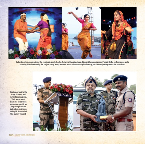 180 181Cultural performances painted the evening in a riot of color, featuring Bharatanatyam, Bihu and bamboo dances, Punjabi Gidha performances and a stunning folk showcase by the Tanjore Group. Every moment was a tribute to unity in diversity, just like our journey across the coastlines.Dignitaries took to the stage to honor and motivate our cyclists. Their warm words made the celebration even more special, as they recognized the dedication, resilience and spirit that carried this journey forward.