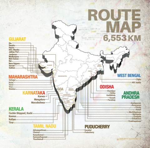 6 7DiuDwarkaHaziraIOCL MundraJakhau PortJambusarMadhavpuraMoti DamanNarNava RajparaSarvadVadinarDigha HDC HaldiaChandipurChilikaKaithkholaKonarkParadeepAmalapuramAnnavaramChiralaKavaliMachilipatnamNaidupetaSompetaSrikakulam VisakhapatnamKaraikal PuducherryAdirampattinamChennaiKanyakumariRamanathapuramThoothukudiGuhagarKoladVasai VirarWadatar KarwarMangaluruMurudeshwarCochin Shipyard, KochiKannurKollamTirurGUJARATWEST BENGALWEST BENGALODISHAANDHRA PRADESHKERALAKARNATAKAMAHARASHTRAGUJARATPUDUCHERRYPUDUCHERRYTAMIL NADUKARNATAKAKERALA7DIGHACHANDIPURKAITHKHOLAKONARKVISAKHAPATNAMSRIKAKULAMSOMPETAAMALAPURAMMACHILIPATNAMNAIDUPETAKARAIKALCHENNAIADIRAMPATTINAMKANYAKUMARIDIUMOTI DAMANHAZIRAJAMBUSARNARMADHAVPURANAVA RAJPARAKOLADWADATARGUHAGARVASAIVIRARTHOOTHUKUDIKAVALICHIRALAANNAVARAMPARADEEPCHILIKAHDC HALDIARAMANATHAPURAMCOCHIN SHIPYARD, KOCHIKANNURKANNURKARWARMANGALURUMURUDESHWARMAHARASHTRATAMIL NADUODISHAANDHRA PRADESHKOLLAMGOADWARKAIOCL MUNDRASARVADVADINARJAKHAU PORT6,553 KMROUTE MAP