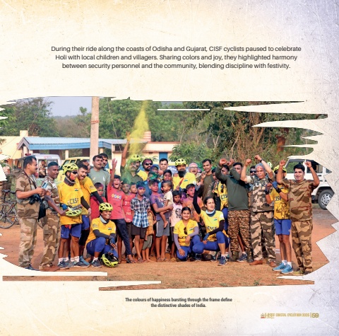 58 59During their ride along the coasts of Odisha and Gujarat, CISF cyclists paused to celebrate Holi with local children and villagers. Sharing colors and joy, they highlighted harmony between security personnel and the community, blending discipline with festivity.The colours of happiness bursting through the frame define the distinctive shades of India.59