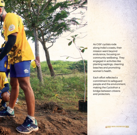 62 63As CISF cyclists rode along India%u2019s coasts, their mission went beyond endurance, focusing on community wellbeing. They engaged in activities like planting saplings, cleaning beaches and promoting women%u2019s health. Each effort reflected a commitment to safeguard people and the environment, making the Cyclothon a bridge between citizens and protectors.63
