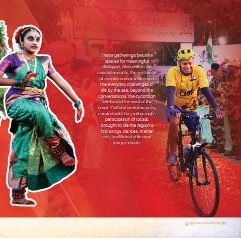 70 71These gatherings became spaces for meaningful dialogue, discussions on coastal security, the resilience of coastal communities and the everyday challenges of life by the sea. Beyond the conversations, the cyclothon celebrated the soul of the coast. Cultural performances, curated with the enthusiastic participation of locals, brought to life the region%u2019s folk songs, dances, martial arts, traditional attire and unique rituals.
