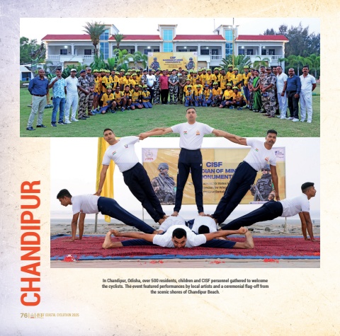 76 77In Chandipur, Odisha, over 500 residents, children and CISF personnel gathered to welcome the cyclists. The event featured performances by local artists and a ceremonial flag-off from the scenic shores of Chandipur%u00a0Beach. CHANDIPUR