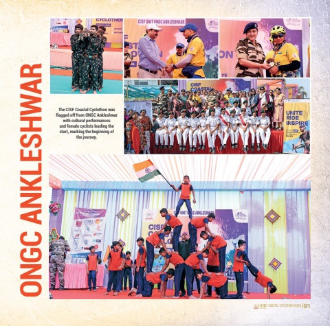 90 91 ONGC ANKLESHWAR The CISF Coastal Cyclothon was flagged off from ONGC Ankleshwar with cultural performances and female cyclists leading the start, marking the beginning of the%u00a0journey.