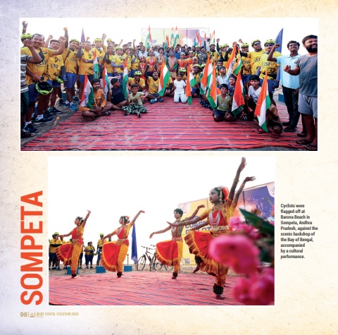 98 99 SOMPETACyclists were flagged off at Baruva Beach in Sompeta, Andhra Pradesh, against the scenic backdrop of the Bay of Bengal, accompanied by a cultural performance.